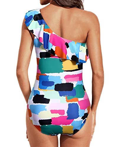 This aqua tummy controlling one shoulder ruffle one piece swimsuit features a modern asymmetric neckline, front ruched details, and removable soft cups, providing a flattering silhouette and perfect for any summer occasion.